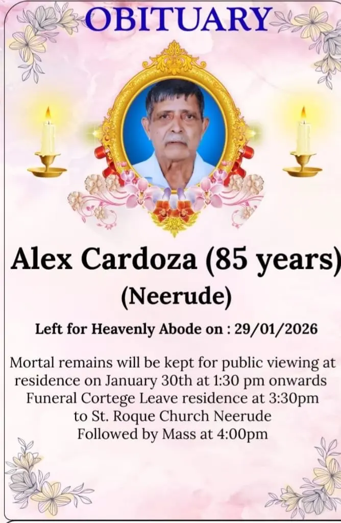 Husband of Juliana Cardoza, St. Antony Ward. Left for Heavenly Abode on 29 Jan 2026. Mortal remains will be kept for public viewing at residence on January 30th at 1:30 pm onwards Funeral Cortege Leave residence at 3:30pm to St. Roque Church Neerude Followed by Mass at 4:00pm