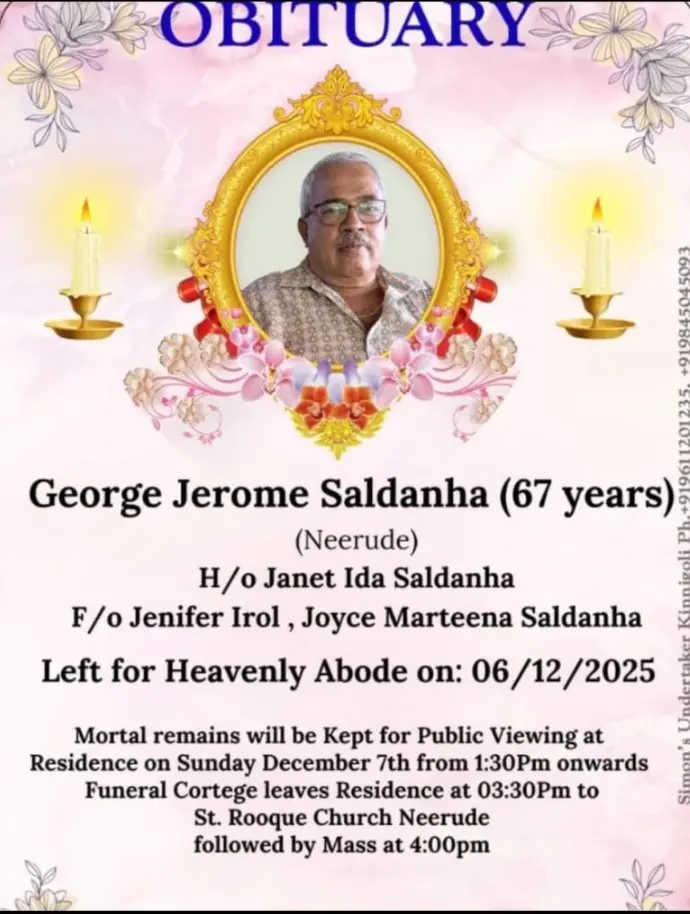 The mortal remains will be kept for public viewing at the family residence on Sunday, 07 December, from 1:30 PM onwards. The funeral cortege will leave the residence at 3:30 PM and proceed to St. Roque Church, Neerude, followed by the Funeral Mass at 4:00 PM.