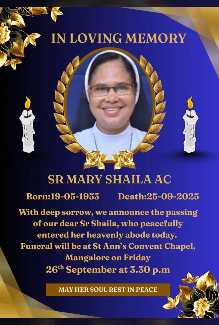 With deep sorrow, we announce the passing of our dear Sr Shaila, who peacefully entered her heavenly abode today. Funeral will be at St Ann's Convent Chapel, Mangalore on Friday.